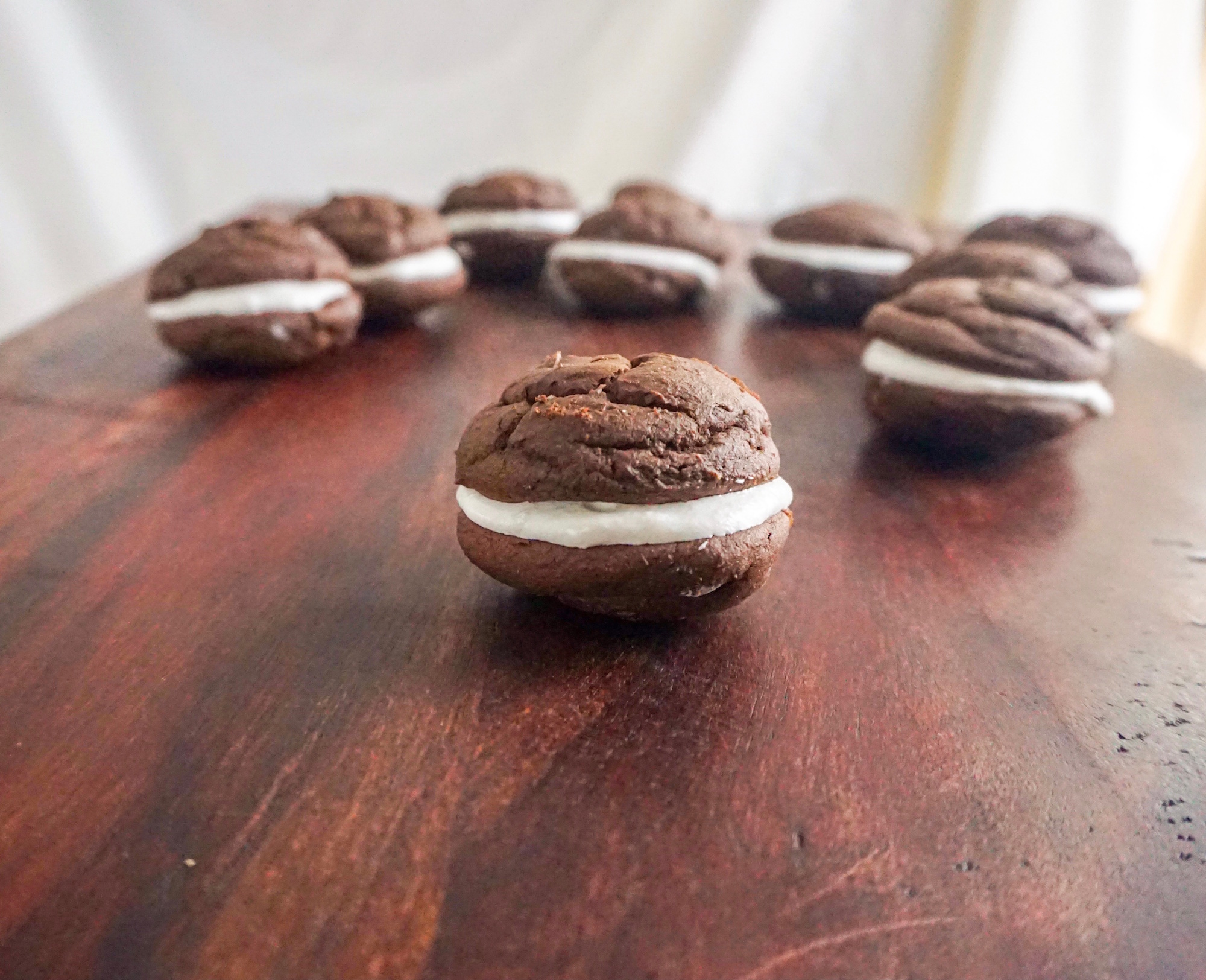 - Flip half of the "pies" upside down. Pipe a blob of filling on top of each and place in the fridge for at least 20 minutes to prevent the filling from oozing all over the place and making a mess. After 20 minutes, place an unfrosted "pie" on top, sandwiching two together. Repeat with the remaining "pies" and filling. Serve immediately or store in the fridge until you're ready to eat. Enjoy!