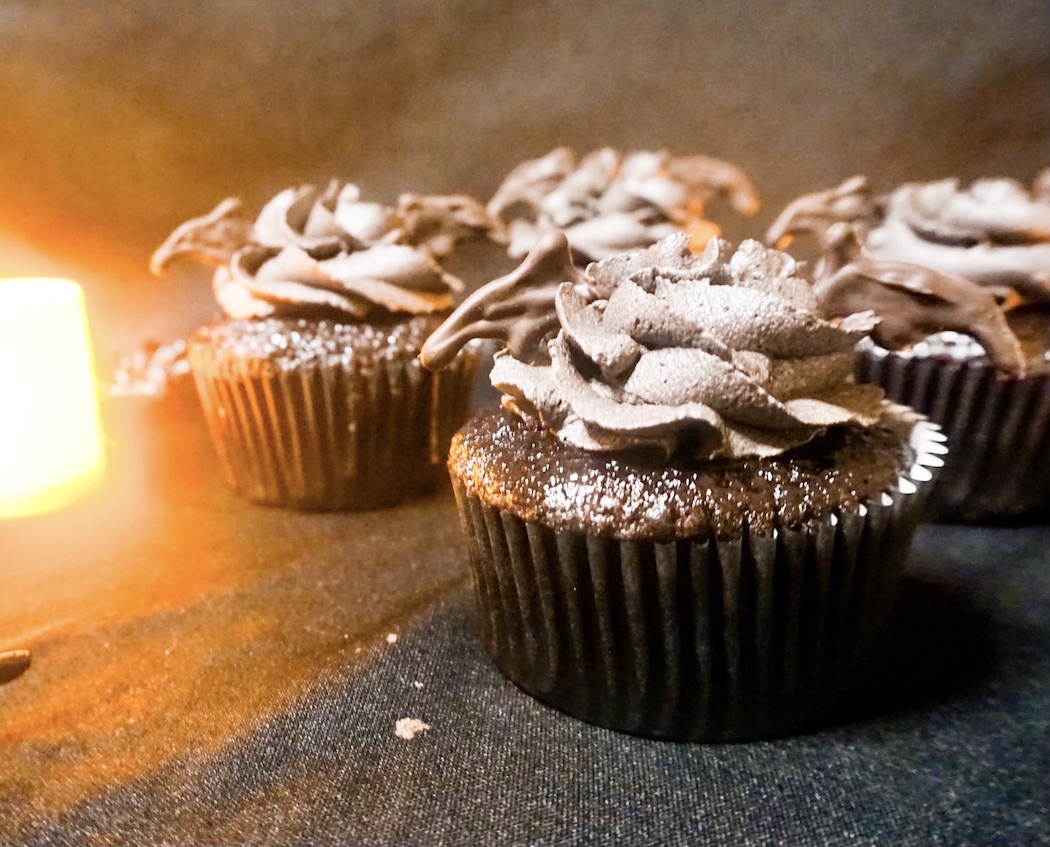 - After the frosting color has darkened, transfer to a piping bag fitted with your desired piping tip. Pipe swirls or what ever you want onto the completely cooled cupcakes. I stuck bat wings in the swirls to decorate. Have fun decorating however you wish and enjoy! Happy Halloween!!